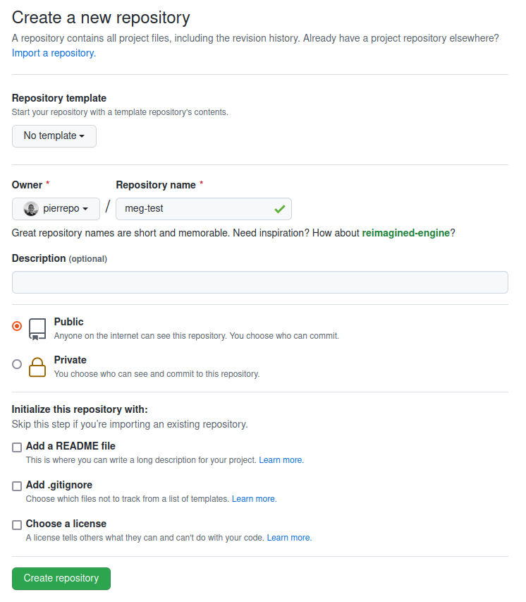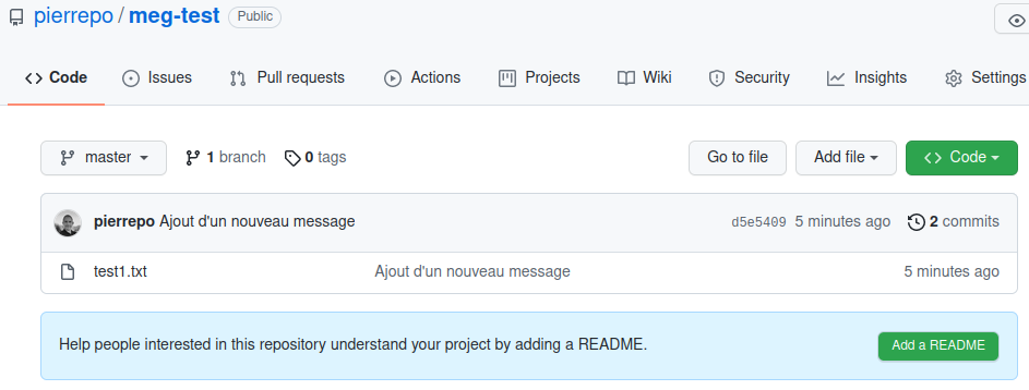 Retournez maintenant sur votre navigateur internet et rafraichissez la page de votre dépôt sur GitHub (a priori https://github.com/<login>/meg-test avec <login> votre identifiant GitHub).